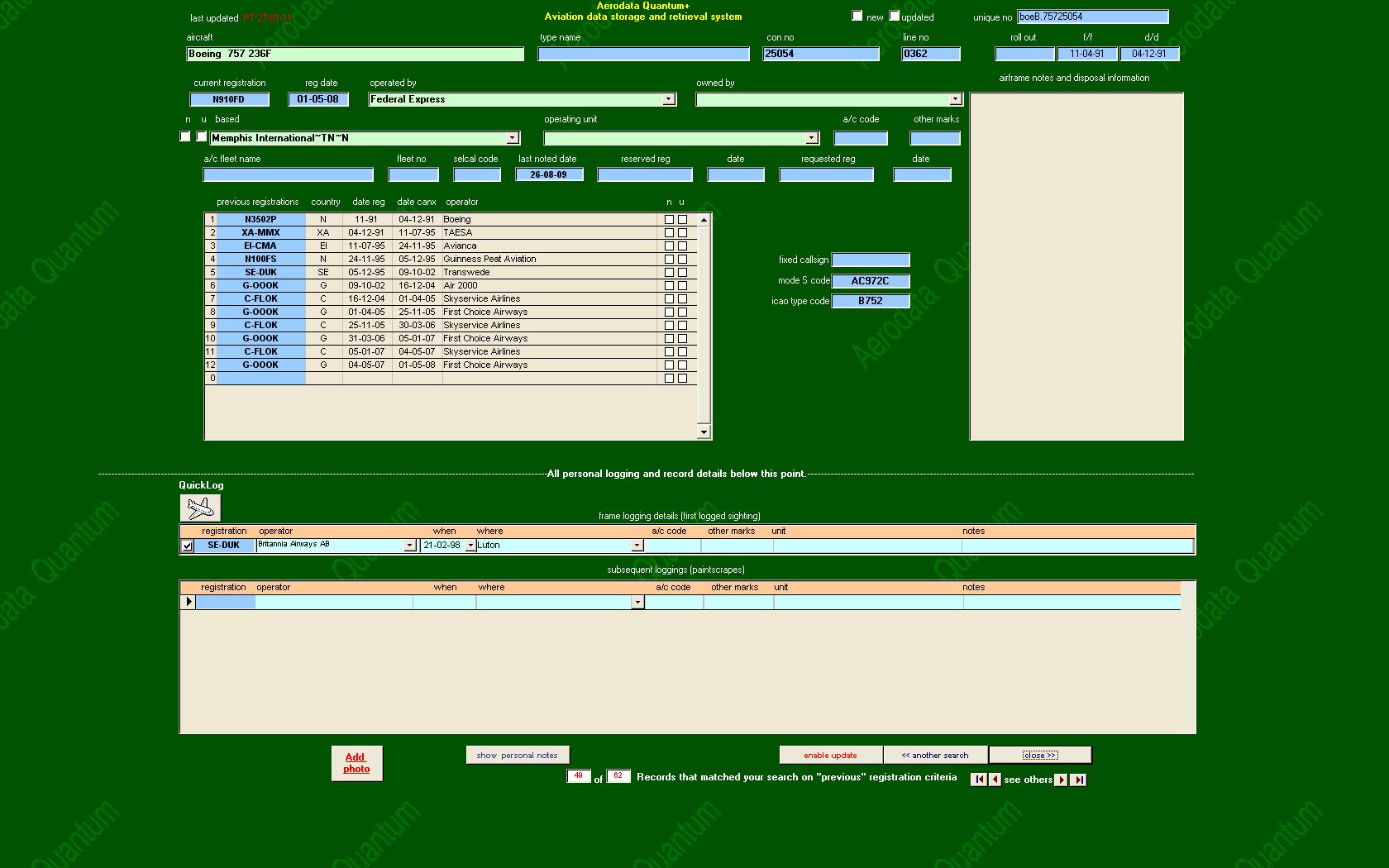 A complete history of any airframe can quickly be accessed from any listing |